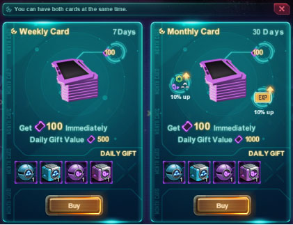 Monthly and Weekly Cards can be stacked. Players can buy the cards of many months at a time.
